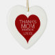 A heart shaped ornament with a lovely THANKS MOM FOR HAVING ME. I LOVE YOU! typography in white letters on a red heart and a red heart on the backside with a personalizable text message
