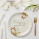 This design features thanksgiving elegant fall autumn leaves, botanical greenery fall foliage, thanksgiving fall autumn paper plate, thanksgiving fall autumn party supplies, modern calligraphy script typography, thanksgiving fall autumn tableware table, a fall autumn maple tree leaves, harvest family get together, a happy thanksgiving quote saying, thanksgiving table décor