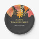 This modern Thanksgiving paper plate is decorated with watercolor fall leaves in autumnal colours on a dark background.