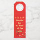 Thanksgiving Bottle Hanger saying " I am most thankful for the taste of fine wine"on a red background and falling dried leaves on the front side. While the back side says "happy Thanksgiving"