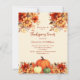 A soft beige background. Decorated with pumpkins and orange and yellow flowers. Personalize and add the party details.