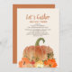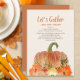 Thanksgiving dinner invitation for friends and/or family. Orange pumpkin and glittery gold fall leaves with text, "Let's gather and give thanks." Add your dinner and location information to this beautiful card.