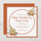 Thanksgiving Dinner Party Invitation designed with pumpkins and autumn coloured leaves on a bright orange and white background with invitation text including: date, time and RSVP details. The reverse side is a matching harvest orange. To personalize, simply replace the sample text using our step-by-step template. Enjoy!
