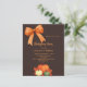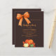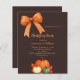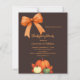 A bistre, dark brown coloured background. Decorated with pumpkins, and a hand-drawn bow and an orange bow. Personalize and add the party details.