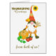 A fun Thanksgiving greeting card 'from Both of Us!, with a cute gnome with a long white beard and a very tall, pointed hat, with a sunflower attached and some fall leaves tucked into his hatband. According to Scandinavian legend, these gnomes live under remote farmhouses and make sure that the farmers look after their crops and livestock. The gnome has some stalks of wheat in one hand and his other hand is resting on a pumpkin and there are some rosy red apples next to the pumpkin. The front cover greeting is 'THANKSGIVING Greetings from both of us' in very dark brown to match the gnome's hatband, mittens and shoes. The inside message is just a suggestion and you can easily change it or remove it completely if you prefer a 'blank inside' card.