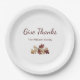 Thanksgiving Give Thanks table paper plate, with brown and gold fall foliage accents. With brown script typography lettering, you can customize with your own text. A Botanical and festive addition to your autumn or holiday party.