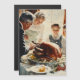 This image depicts a classic Thanksgiving scene reminiscent of vintage illustrations. It features a family gathered around a dinner table, joyfully watching as an older man carves a large, golden-brown roasted turkey. The warm light pouring through the window illuminates the family members' faces, highlighting their happiness and anticipation. The table is elegantly set with a bountiful feast, including grapes and decorative garnishes surrounding the turkey. The overall atmosphere evokes a sense of nostalgia, warmth, and celebration.