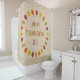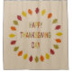 This awesome shower curtain features a digital art image of a series of Oak leaves in shades of red, orange, yellow and green arranged in a circle around some text with alternating letters of red, yellow, orange and green that says Happy Thanksgiving Day.