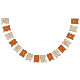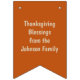 This awesome Thanksgiving bunting features a digital art image of a series of Oak leaves in shades of red, orange, yellow and green arranged in a circle around some text with alternating letters of red, yellow, orange and green that says Happy Thanksgiving Day. There is custom text on alternating flags so you can include a message.