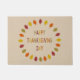 This awesome doormat features a digital art image of a series of Oak leaves in shades of red, orange, yellow and green arranged in a circle around some text with alternating letters of red, yellow, orange and green that says Happy Thanksgiving Day.