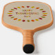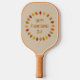 This awesome Pickleball Paddle features a digital art image of a series of Oak leaves in shades of red, orange, yellow and green arranged in a circle around some text with alternating letters of red, yellow, orange and green that says Happy Thanksgiving Day.