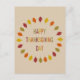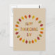 This cute postcard features a digital art image of a series of Oak leaves in shades of red, orange, yellow and green arranged in a circle around some text with alternating letters of red, yellow, orange and green that says Happy Thanksgiving Day.