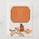Celebrate your child's November/Holiday birthday with this adorable, festive invitation. It features a tiny dot background with an owl sitting on a fall tree branch wearing a pilgrim hat. Your message has a decorative double frame.