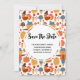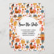 Save the date card with a seasonal fall pattern, Corn, mushrooms and flora. Along with turkeys and scarecrows to honour the Thanksgiving tradition.