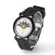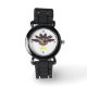 This awesome watch features a cartoon of a turkey with big black eyes, a small yellow beak and tail feathers sticking up. The feet are facing in opposite directions making the turkey look goofy. The turkey has pink text on its’ belly that says “Happy Thanksgiving” and it looks like the feathers have been plucked out to reveal the message.