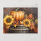 A pretty postcard for wishing a Happy Thanksgiving! A barrel topped with fall foliage, sunflowers and pumpkins and pretty little butterflies too.