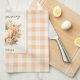 Thanksgiving kitchen towel in elegant modern farmhouse style, featuring floral pumpkins and gingham in soft orange, cream, and green on the cream background. Easily personalize the text. - Kate Eden Art