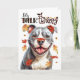 A funny Thanksgiving greeting for the dog lover and dog moms and dad of Staffordshire Terriers, featuring a cute pup who is happy with falling autumn leaves and turkey humour.