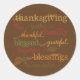 Round sticker is shown with a brown background and a Thanksgiving words print.