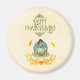 A magnet with a cute thanksgiving design. A funny looking turkey, wearing a pilgrim hat and sitting down with his legs splayed out, eating some pumpkin pie. He has a goofy look on his face too. Holding a knife and fork and ready to dive in to this delicious dessert.