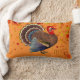 This throw pillow is shown with a autumn fall leaves and a Thanksgiving turkey print on a light orange colour background.