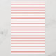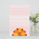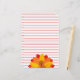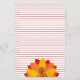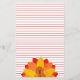 A red lined stationery paper featuring a whimsical turkey with colourful feathers in shades of yellow, orange, and red illustrated with watercolor. You can adjust the size and placement of the turkey to fit your needs. Great for holiday letters and crafts!