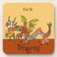 A whimsical cartoon dragon illustration on this drink coaster is in browns, golds, orange, with a pale blue underside. You can edit text to create your own personalized gift. Need help, email lilly@lillyarts.com