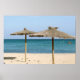 Thatch beach umbrellas, sand, blue ocean and sky, painting effect