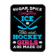 Hockey theme flexible magnet for the hockey girl with hockey puck and sticks with text of off white, pink, and blue that reads Sugar, Spice and Everything Ice That's What Hockey Girls Are Made Of.