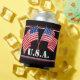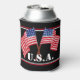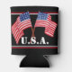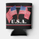 The black background ha a red and white border at the top and bottom of the design. In the centre there are two American flags and at the bottom are the letter U.S.A., in a stencil type font.