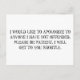 "'I would like to apologize to anyone I have not offended. Please be patient, I will get to you shortly" in vintage, distressed lettering
