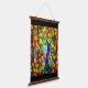 Colourful wood topped wall tapestry created with AI software features a surreal stained glass apple tree with green and gold leaves, and red apples, that create a frame as well. Added black top and bottom borders.