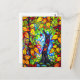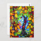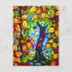 Colourful digital art postcard created with AI software features a surreal stained glass apple tree with green and gold leaves, and red apples, that create a frame as well.