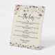 This tabletop sign is a great way to let your guests know the bar menu at your wedding reception. It features a rustic boho chic design with a cream coloured background and a bounty of wildflowers in earthtone shades of terracotta clay and dusty rose. The title is written in fancy script calligraphy with elegant swashes and reads: The Bar. There is space for your drinks menu as well as the names of the couple and wedding date.