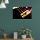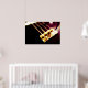The original abstract photograph on this Art Poster focuses on the base of an electric bass guitar, the part where the strings begin and rise all the way up to the neck. The closeup photo coloration is done in rich, deep warm browns with a golden light on the metal plate, strings, screws and springs.
