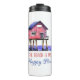 A thermal tumbler with a beach house on stilts watercolor style, with the quote, "The Beach is my Happy Place." Ai art. generativecontent