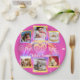 Pink birthday party plates are customizable. The say, "The Best Ever" with a beautiful pastel to neon - like design with violet, yellow, pink and orange hue colours, a matching rainbow and heart, plus 6 photo templates to easily download photos of your 6 "best" on to.