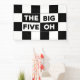 50th birthday party banner features a bold black and white checkered pattern with the words "The Big Five Oh" in alternating white on black and black on white text.