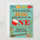 A colourful fishing themed first birthday invitation to help celebrate 'The Big One'. Pops of red, green, orange, and blue fish and gear provide a colourful contrast to the light blue background. The back features a fisherman in a boat with the phrase 'Gone Fishing'.