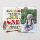 A colourful fishing themed first birthday invitation to help celebrate 'The Big One'. Pops of red, green, orange, and blue fish and gear provide a colourful contrast to the distressed grey wood background. The back features a fisherman in a boat with the phrase 'Gone Fishing'. Add a photo of your precious little one.