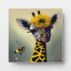 Tabletop art plaque features AI generated surreal painting of a whimsical giraffe morphed with a bumblebee.