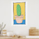 This poster has a simple composition, hand drawn using pens and watercolour, of a single lobed cactus in a flower pot. The background is yellow and blue, the pot is pinky beige and the cactus is very green and spiky, all contained within a thin black border, with a white surround. It's a charming example of simple, modern art.