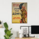 A recruiting poster from World War I showing a soldier standing next to an American flag and blowing a bugle.