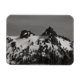 A black and white photograph of two peaks in the Tatoosh Range known as The Castle and The Pinnacle. The mountain range is covered in snow despite it being summer. There are trees and stone scattered about the landscape and mountains. The sun's position allows for shadows to be cast on the mountain. Incognito clouds grace the sky. Image Copyright ©2023 Kimberly J Tilley. zazzle.com/store/developingnature