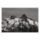 A black and white photograph of two peaks in the Tatoosh Range known as The Castle and The Pinnacle. The mountain range is covered in snow despite it being summer. There are trees and stone scattered about the landscape and mountains. The sun's position allows for shadows to be cast on the mountain. Incognito clouds grace the sky. Image Copyright ©2023 Kimberly J Tilley. zazzle.com/store/developingnature