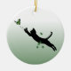 A black cat with green eyes jumping in the air trying to catch a beautiful green butterfly.
