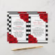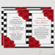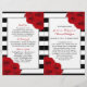 The chic modern luxe wedding collection features a classic black and white stripe background accentuated with beautiful ruby red roses and a faux silver foil frame.