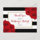 The chic modern luxe wedding collection features a classic black and white stripe background accentuated with beautiful ruby red roses and a faux gold foil frame.