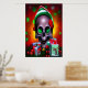 A skull with a green Christmas beanie on a red, yellow, green background and Christmas present in front of the skull. This is a AI generated art.