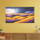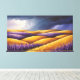 A vibrant landscape painting featuring rolling hills covered in a patchwork of golden fields and purple wildflowers. A dramatic, stormy sky looms overhead, casting a dramatic shadow over the scene. The overall mood is one of peaceful tranquillity, contrasted by the impending storm.